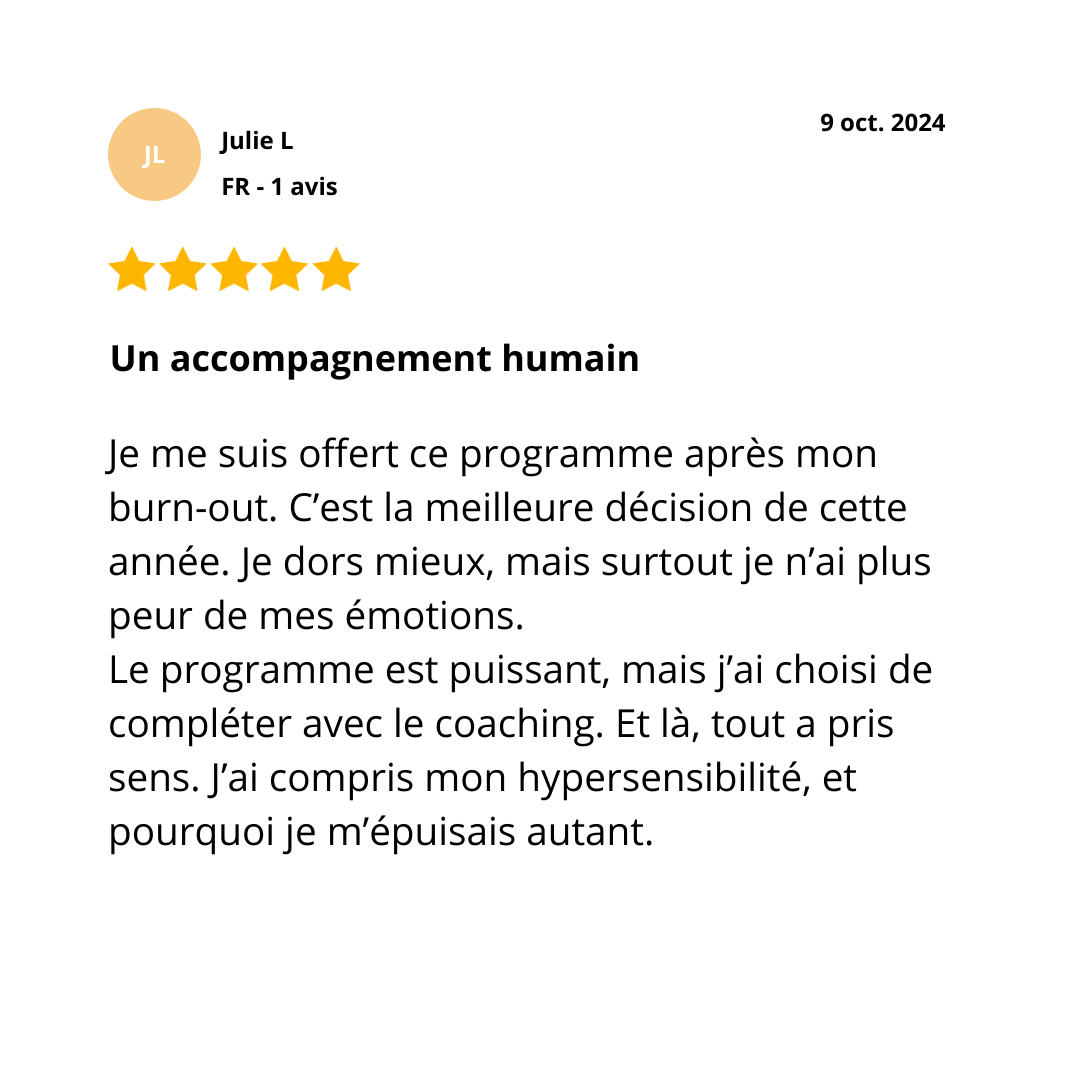 Et c’est pour ça qu’aujourd’hui, je guide les femmes comme toi, comme nous, les femmes hypersensibles, épuisées de porter le monde sur leurs épaules, à retrouver la paix, la clarté et une vie qui leur ressemble enfin (en te faisant "économiser" 3 ans de thérapie ...)