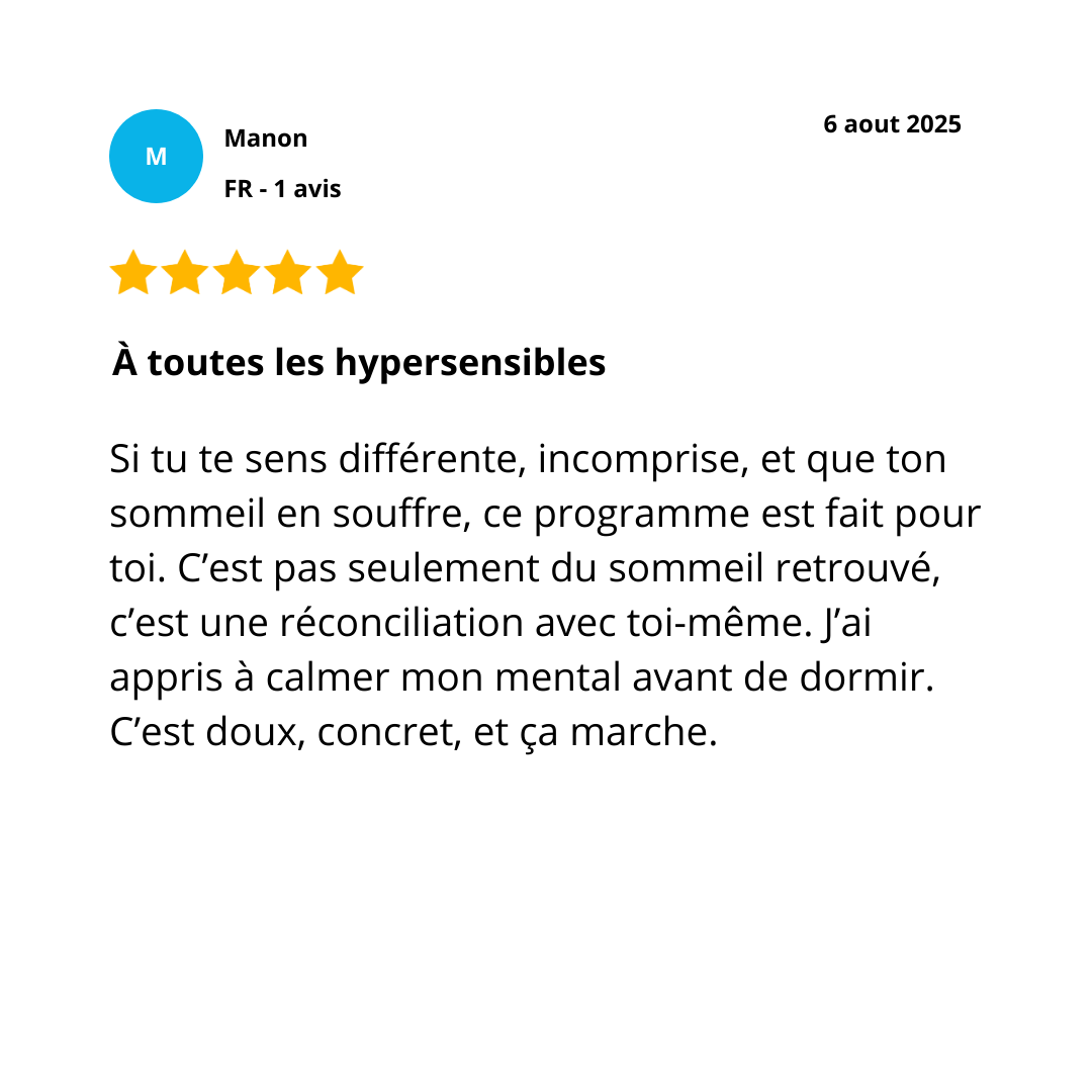 Ce programme a été pensé spécialement pour les femmes hypersensibles. Ton hypersensibilité n’est pas un frein : au contraire, elle devient une force. Les audios sont conçus pour apaiser ton mental sans te demander de “penser à rien” (ce qui est impossible quand on est hypersensible).